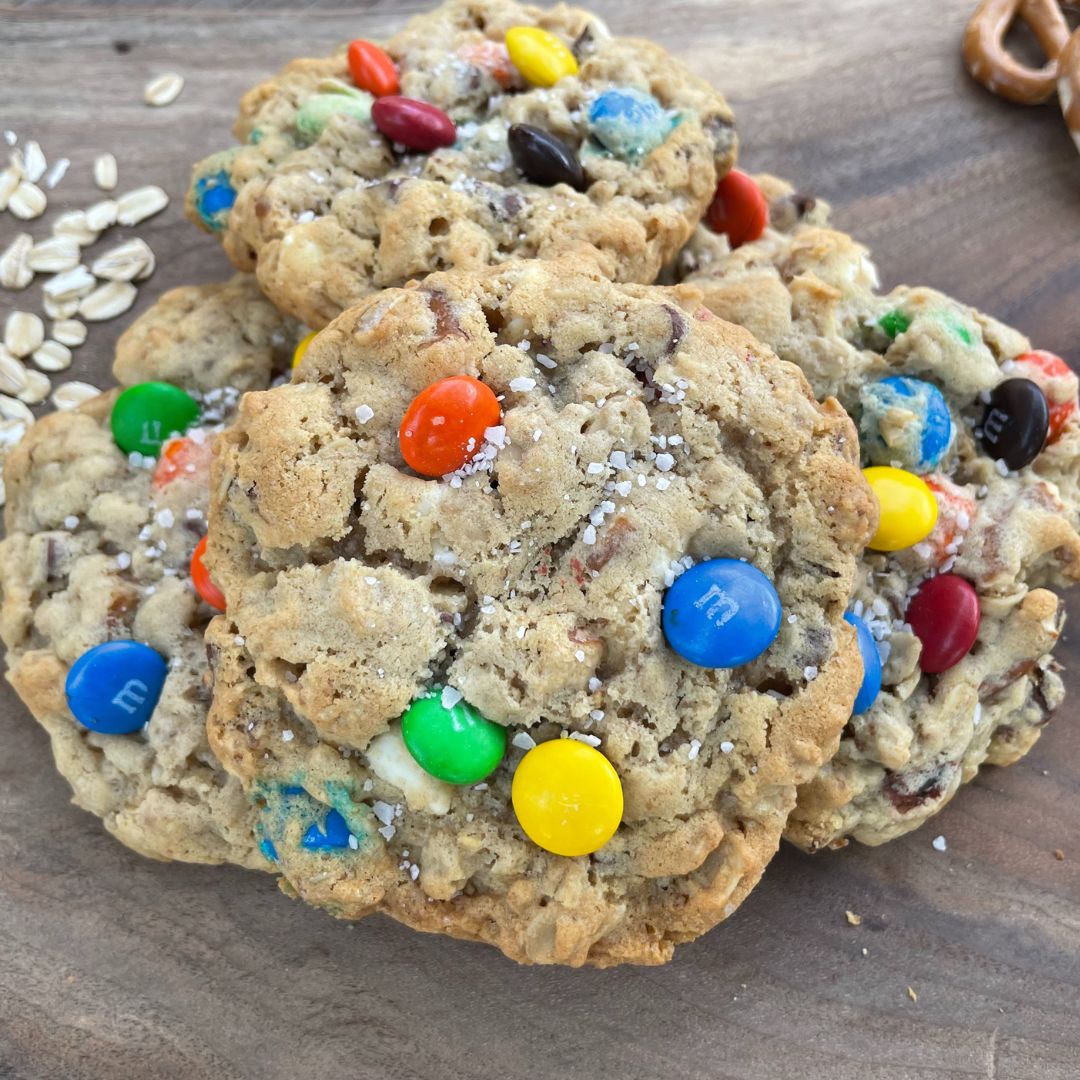 Embrace the sweet & salty flavors and textures of our Monster Cookies, packed with a perfect combination of ingredients including chocolate chips, white chocolate chips, M&M candies, oats, and pretzels. Once pulled out of the oven a sprinkling of coarse salt is added to top of this delicious flavor profile. Each cookie is a hearty blend of sweet and savory, creating an unforgettable treat for any occasion.